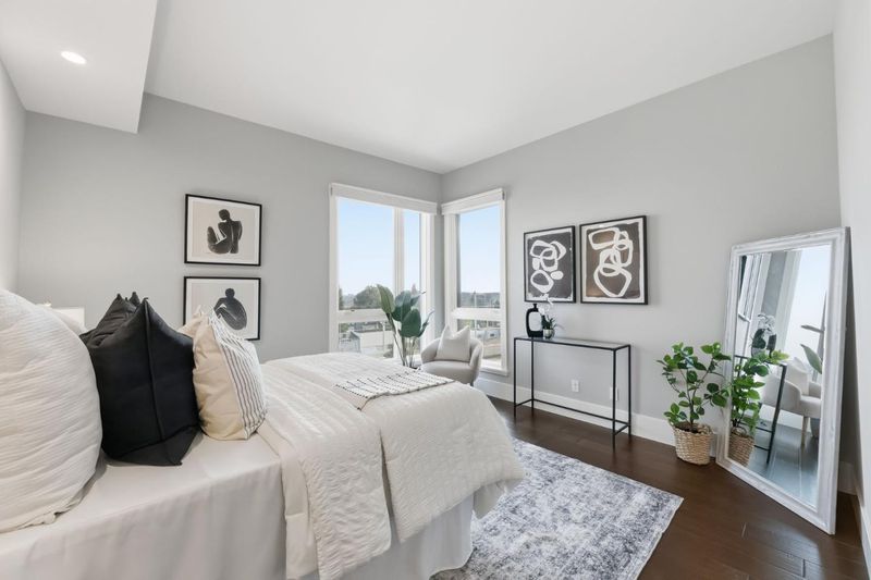 Rarely available oversized 2-bdrm condo, larger than many 3 bdrm units in building. This beautifully updated top-floor residence offers an expansive living area w/ ample room for a dedicated home office, thoughtfully set apart from the main entertaining spaces. Set in a newer, meticulously maintained building, this home blends comfort, style, & convenience. Soaring ceilings & abundant natural light enhance the open-concept layout, ideal for both everyday living & entertaining. The gourmet kitchen is a chef's dream, featuring stainless appliances, quartz countertops, & custom cabinetry. The spacious living area flows seamlessly to a private patio, perfect for relaxing or dining al fresco. The generous primary suite includes a nicely finished walk-in closet & spa-inspired bath. The 2nd bdrm (en-suite) offers flexibility for guests, a home office, or family needs. Additional highlights include in-unit walk-in laundry room, a large storage area off the kitchen, central A/C, 2 assigned parking spaces, a public EV charger, & low HOA dues. Residents also enjoy a communal BBQ area, ideal for casual gatherings and entertaining. Ideally located in desirable Belmont, close to top-rated schools (buyer to verify), Caltrain, major commuter routes/tech shuttles, & vibrant shopping and dining.