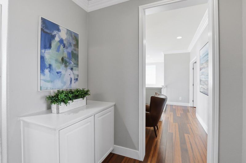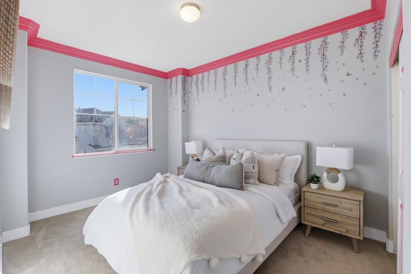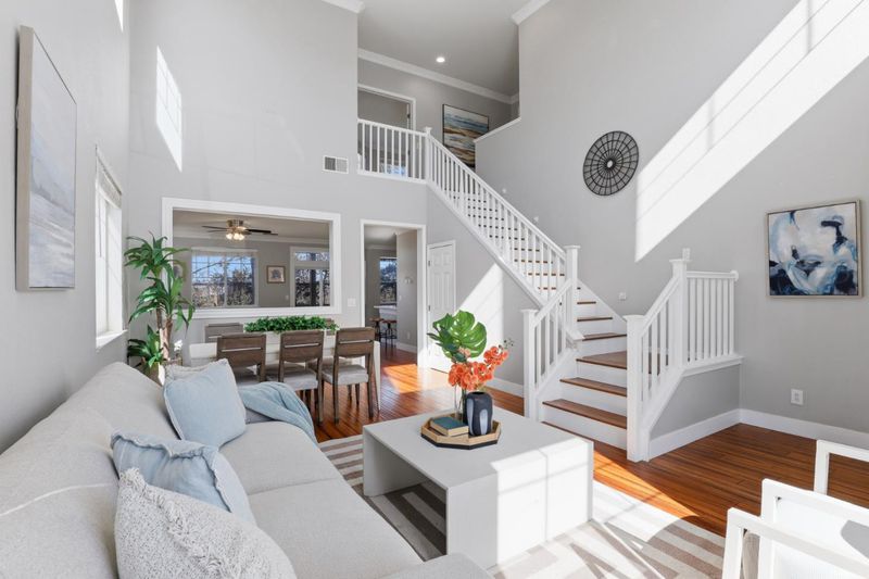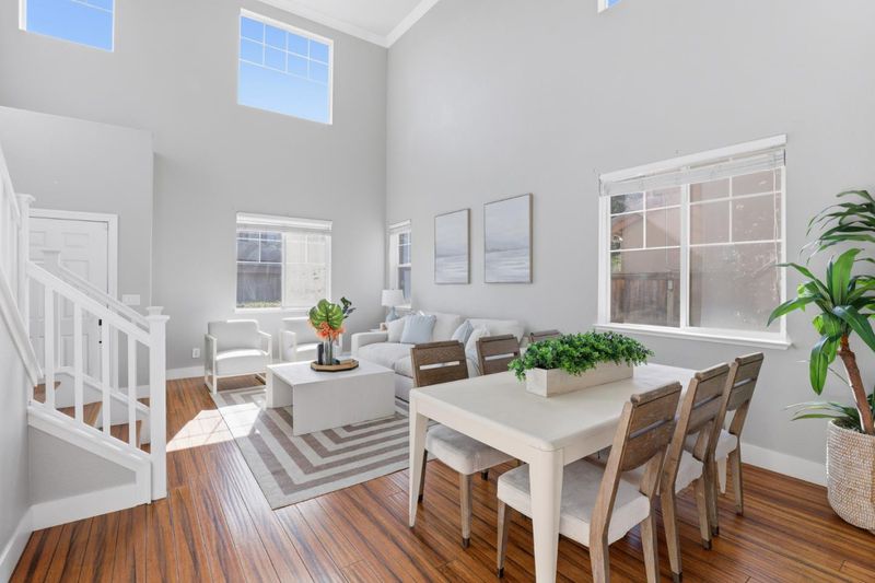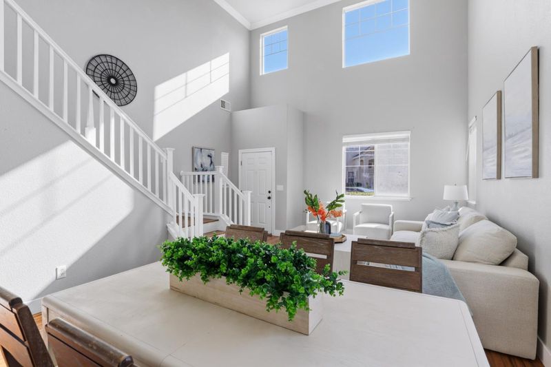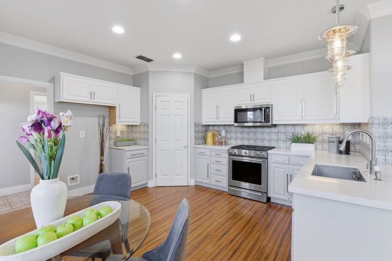 Welcome to 609 Rockspray Circle in Pittsburg, a well maintained two story home located in a desirable gated community. This residence offers 4 bedrooms, 2.5 bathrooms, and 2,135± SqFt of living space on a 4,200± SqFt lot with owned solar panels for added energy efficiency. Interior features include bamboo flooring, classic crown molding, recessed lighting, central HVAC, and d/p windows throughout. The living room showcases high ceilings, abundant natural light, recessed lighting, and a convenient coat closet. The open great room features a gas fireplace and modern pendant lighting, flowing into a stylish kitchen with quartz peninsula island, designer tile backsplash, white shaker cabinets, KitchenAid gas range and microwave, walk in pantry, and direct access to the backyard. A functional laundry mudroom includes patterned tile flooring, cabinetry, and an updated vanity with quartz countertop. The primary suite offers bamboo flooring, double door entry, ceiling fan, and abundant natural light. The primary bathroom features porcelain tile flooring, double vanity, soaking tub, glass enclosed walk in shower, and a private water closet. The backyard offers double covered patios, a stacked stone retaining wall, and mature fruit trees including peach, pear, and jujube.
