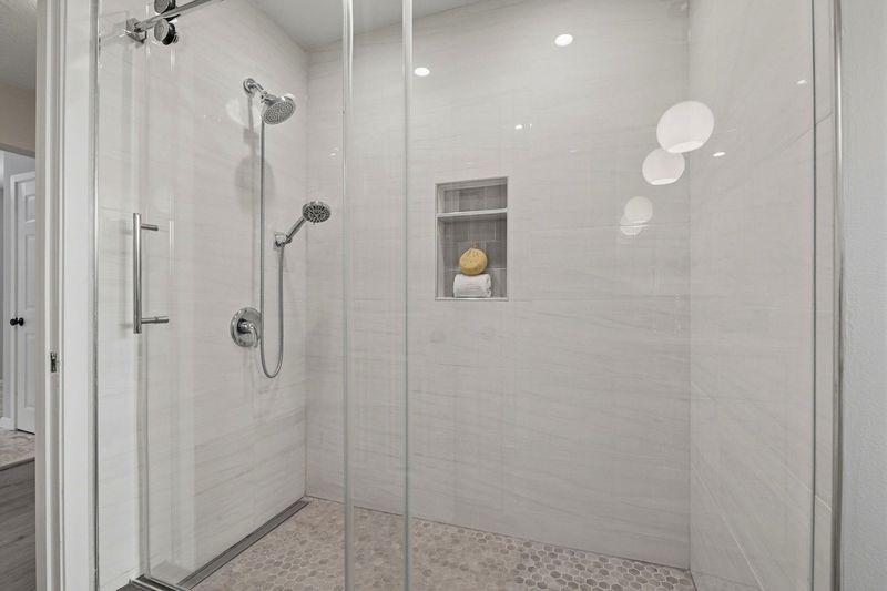 Solid Surface, Stall Shower, Tile, Updated Baths, Double Vanity, Multiple Shower Heads, Stone, Window
