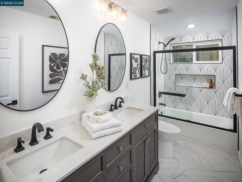 - Shower Over Tub, Stall Shower, Tile, Updated Baths, Double Vanity, Stone, Window