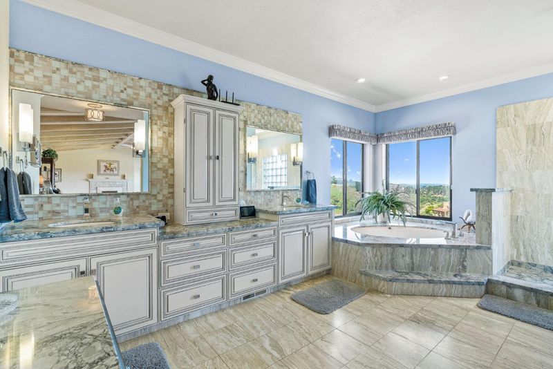 Double Sinks, Full on Ground Floor, Marble, Primary - Sunken Tub, Showers over Tubs - 2+, Skylight, Stall Shower, Stall Shower - 2+, Stone